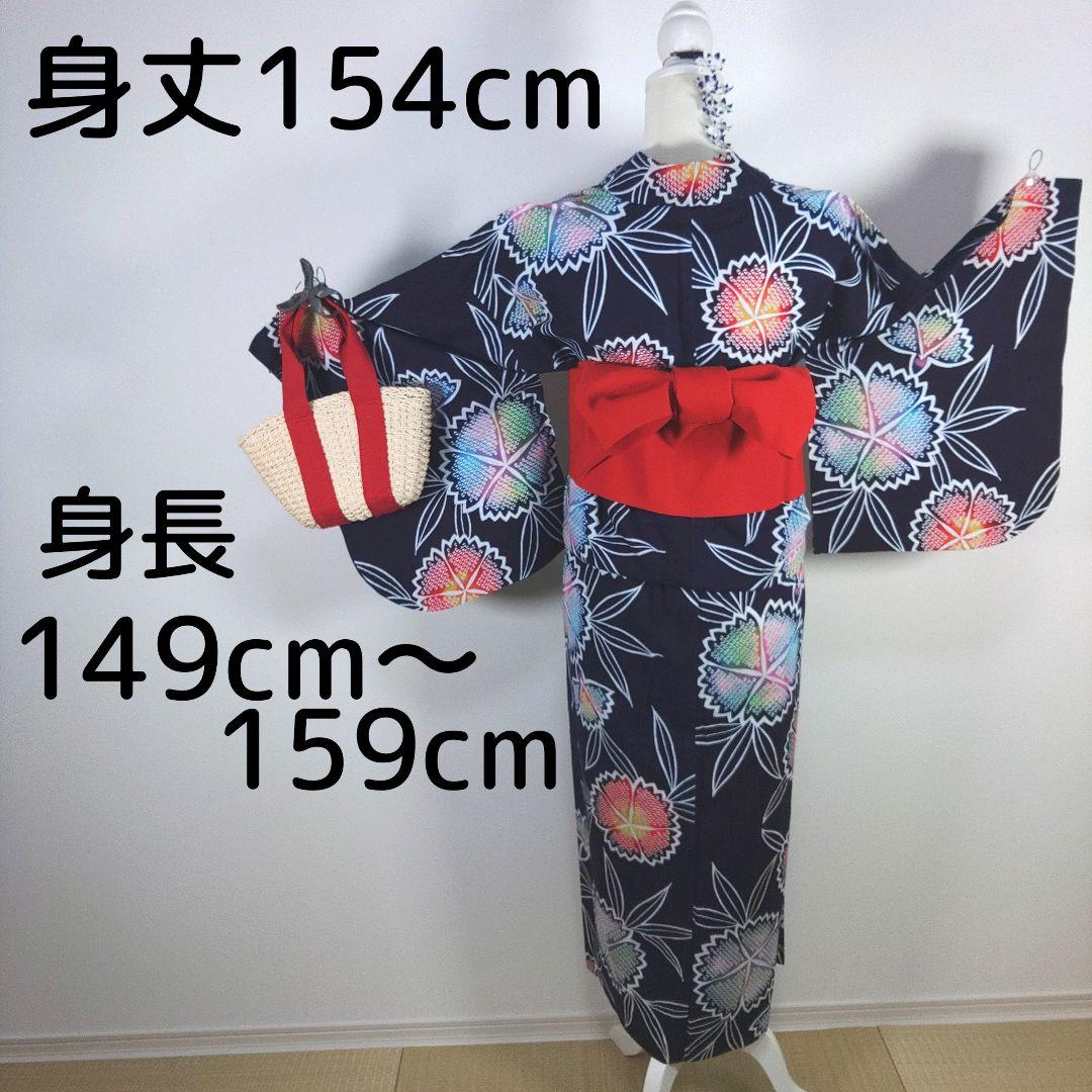 レトロ レディース 浴衣 手縫い仕立て 身丈154 花柄 ネイビー 半幅帯 赤着物・浴衣
